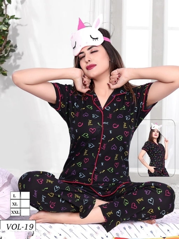 Siya Stylish Women Nightsuits Top Fabric: Cotton Bottom Fabric: Cotton Top Type: Shirt Bottom Type: Pyjamas Multipack: 1 Sizes: XL (Top Bust Size: 44 in, Top Length Size: 25 in, Bottom Waist Size: 38 in, Bottom Length Size: 41 in) L (Top Bust Size: 42 in, Top Length Size: 24 in, Bottom Waist Size: 37 in, Bottom Length Size: 40 in) XXL (Top Bust Size: 46 in, Top Length Size: 26 in, Bottom Waist Size: 39 in, Bottom Length Size: 42 in)