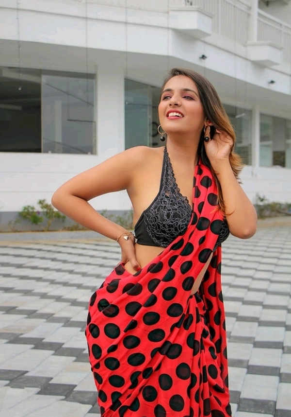 Red-Black, Polka Print Georgette Saree with Blouse Piece