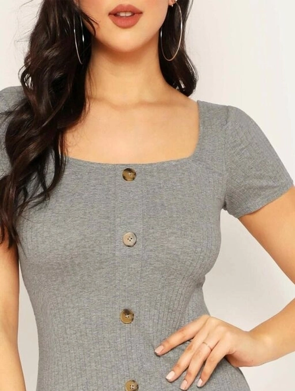 Front Button Square Neck Ribbed Bodycon Dress