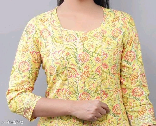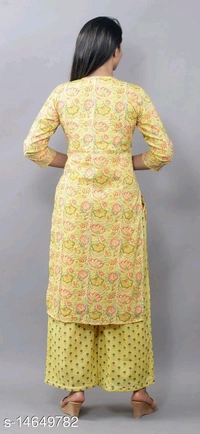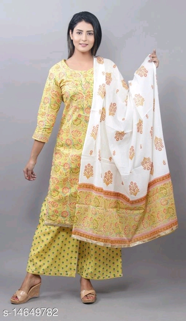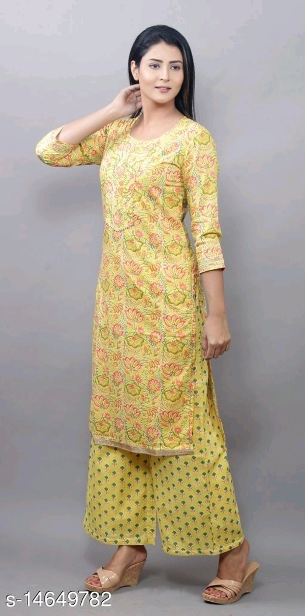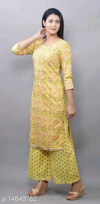 Women Cotton Straight Printed Long Kurti With Palazzos Kurta Fabric: Cotton Bottomwear Fabric: Cotton Fabric: Cotton Sleeve Length: Three-Quarter Sleeves Set Type: Kurta With Dupatta And Bottomwear Bottom Type: Palazzos Pattern: Printed Multipack: Couples Set Sizes: XL (Bust Size: 42 in, Shoulder Size: 12 in, Kurta Waist Size: 42 in, Kurta Length Size: 44 in, Bottom Waist Size: 32 in, Bottom Hip Size: 44 in, Bottom Length Size: 39 in, Duppatta Length Size: 2.35 m) L (Bust Size: 40 in, Shoulder Size: 11.5 in, Kurta Waist Size: 40 in, Kurta Length Size: 44 in, Bottom Waist Size: 30 in, Bottom Hip Size: 42 in, Bottom Length Size: 39 in, Duppatta Length Size: 2.35 m) XXL (Bust Size: 44 in, Shoulder Size: 12.5 in, Kurta Waist Size: 44 in, Kurta Length Size: 44 in, Bottom Waist Size: 34 in, Bottom Hip Size: 46 in, Bottom Length Size: 39 in, Duppatta Length Size: 2.35 m) M (Bust Size: 38 in, Shoulder Size: 11 in, Kurta Waist Size: 38 in, Kurta Length Size: 44 in, Bottom Waist Size: 28 in, Bottom Hip Size: 40 in, Bottom Length Size: 39 in, Duppatta Length Size: 2.35 m) Country of Origin: India