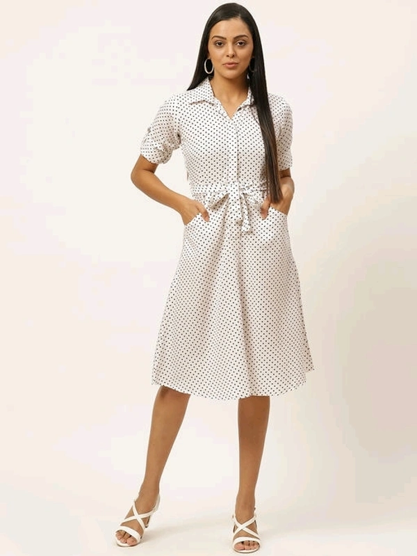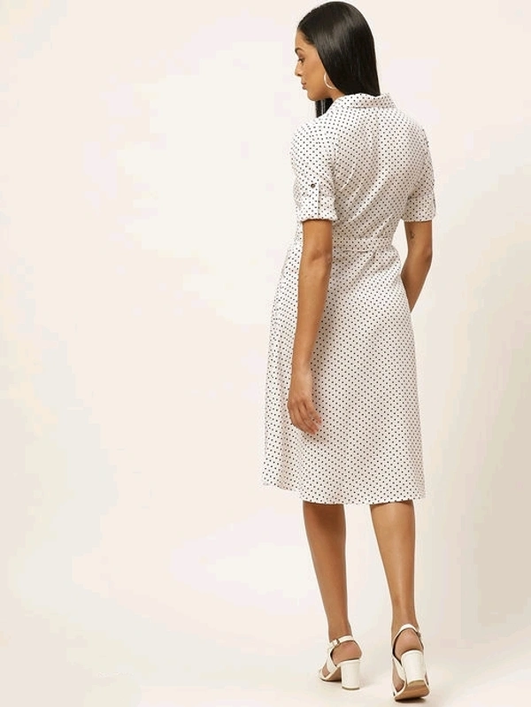U&F White Poly Crepe Shirt Collar Party Fit and Flare Dress Fabric: Poly Crepe Sleeve Length: Three-Quarter Sleeves Pattern: Printed Multipack: 1 Sizes: S (Bust Size: 36 in, Length Size: 42 in) L (Bust Size: 40 in, Length Size: 42 in) M (Bust Size: 38 in, Length Size: 42 in) Treat yourself to a new dress from U&F and embrace your personal style. Complement this piece with a pair of caged heels, your favourite bag and some minimalistic silver jewellery for a classy date ensemble. Country of Origin: India