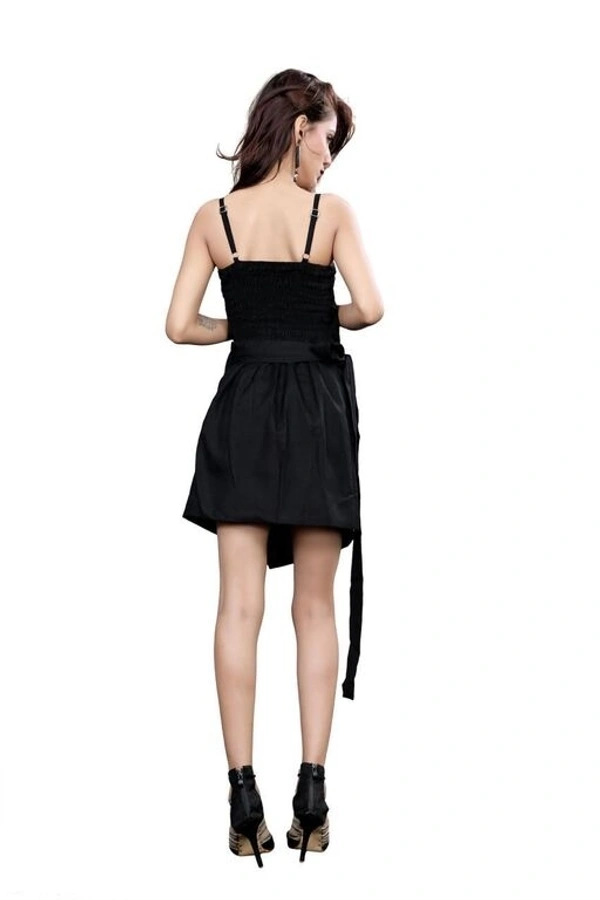 Urbane Graceful Women Dresses Fabric: Cotton Blend Sleeve Length: Sleeveless Pattern: Solid Sizes: S (Bust Size: 32 in, Length Size: 33 in) XS (Bust Size: 30 in, Length Size: 33 in) M (Bust Size: 34 in, Length Size: 33 in) Black overlap with smoking pattern dress Country of Origin: India