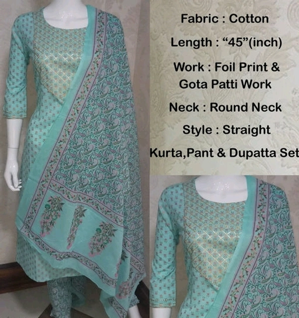Vbuyz Women's Foil Print & Gota Patti Work Straight cotton Peach Kurta, Pant & Dupatta15