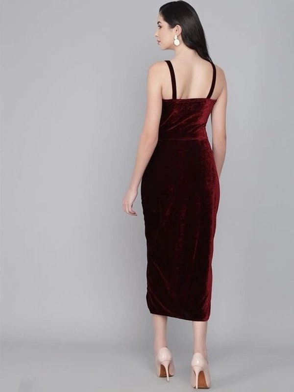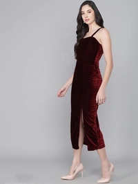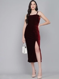 INFITROB Women Maroon Valvet Strap Onepiece Dress Fabric: Velvet Sleeve Length: Sleeveless Pattern: Solid Multipack: 1 Sizes: S (Bust Size: 35 in, Length Size: 50 in) XL (Bust Size: 41 in, Length Size: 50 in) L (Bust Size: 39 in, Length Size: 50 in) M (Bust Size: 37 in, Length Size: 50 in) Country of Origin: India