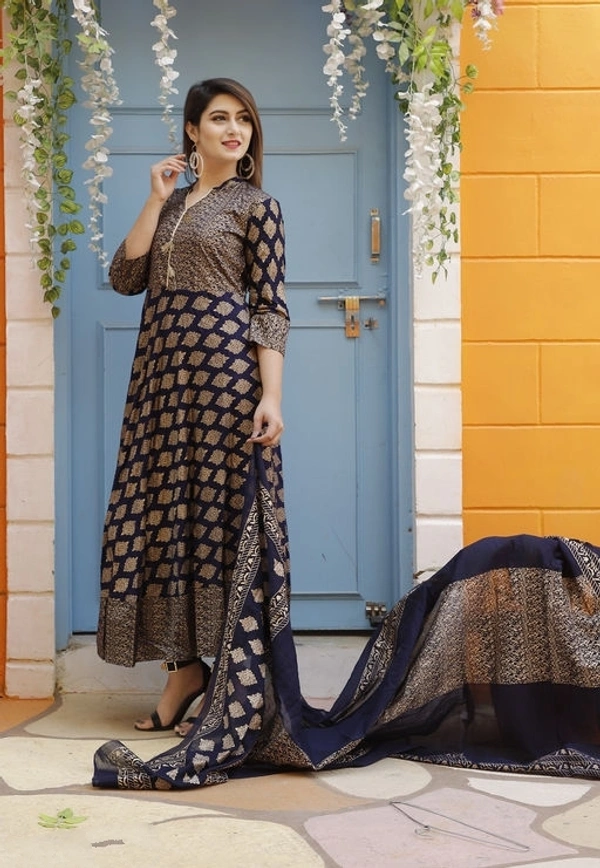 Women's Printed Anarkali Kurta with Dupatta Kurta Fabric: Rayon Sleeve Length: Three-Quarter Sleeves Set Type: Kurta With Dupatta Pattern: Printed Multipack: Single Sizes: XL (Kurta Length Size: 52 in Duppatta Length Size: 2.25 m) L (Kurta Length Size: 52 in Duppatta Length Size: 2.25 m) M (Kurta Length Size: 52 in Duppatta Length Size: 2.25 m) XXL (Kurta Length Size: 52 in Duppatta Length Size: 2.25 m) Country of Origin: India