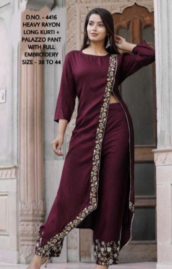 Women Rayon A-line Embroidered Long Kurti With Palazzos