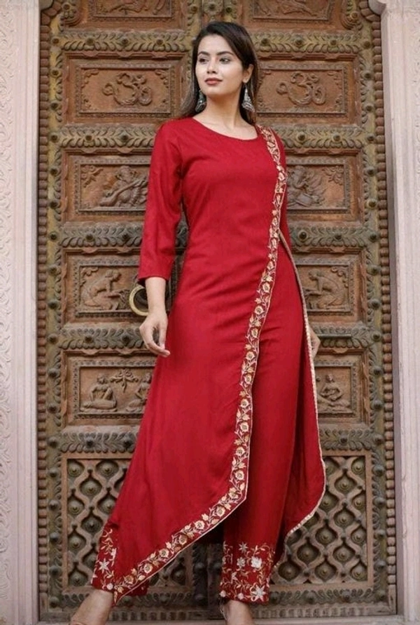 Women Rayon A-line Embroidered Long Kurti With Palazzos Kurta Fabric: Rayon Bottomwear Fabric: Rayon Fabric: Rayon Sleeve Length: Three-Quarter Sleeves Set Type: Kurta With Bottomwear Bottom Type: Palazzos Pattern: Solid Multipack: Single Sizes: M (Bust Size: 38 in, Kurta Waist Size: 34 in, Kurta Length Size: 44 in, Bottom Length Size: 40 in) L (Bust Size: 40 in, Kurta Waist Size: 36 in, Kurta Length Size: 44 in, Bottom Length Size: 40 in) XL (Bust Size: 42 in, Kurta Waist Size: 38 in, Kurta Length Size: 44 in, Bottom Length Size: 40 in) XXL (Bust Size: 44 in, Kurta Waist Size: 40 in, Kurta Length Size: 44 in, Bottom Length Size: 40 in) Dispatch: 1 Day