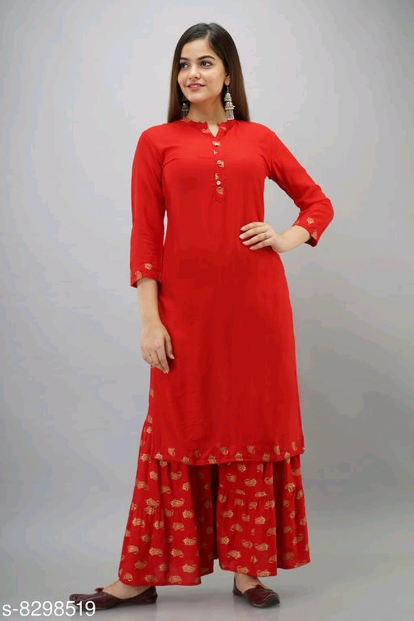 Women's Solid Rayon Slub Kurta with Sharara Kurta Fabric: Rayon Slub Bottomwear Fabric: Rayon Fabric: Rayon Slub Set Type: Kurta With Bottomwear Bottom Type: Sharara Sizes: M Sleeve length :Three-Quarter Sleeves Country of Origin: India
