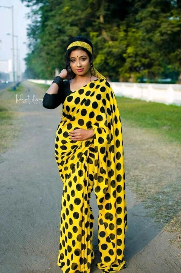 Yellow-Black, Polka Dot georgette Saree with Blouse Piece